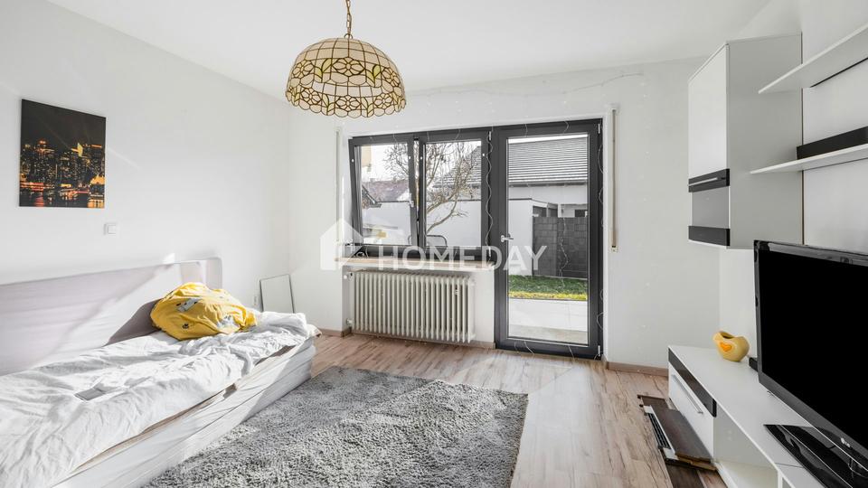 Das Wohnzimmer bildet den Mittelpunkt und bietet einen direkten Zugang zur nach Süden ausgerichteten und überdachten Terrasse mit eigenem Gartenanteil. Ein herrlicher Platz, um den Tag entspannt zu beginnen oder laue Sommerabende zu genießen.