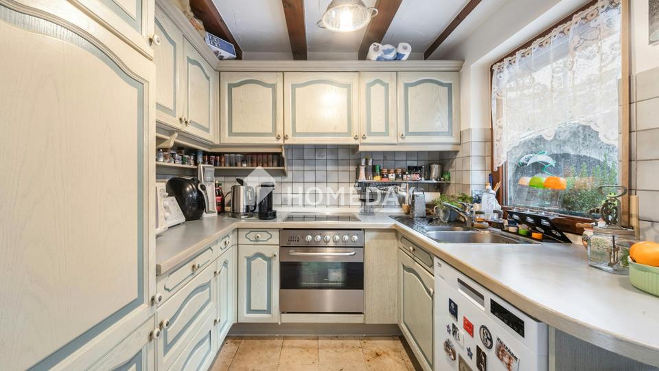 Nur wenige Schritte weiter gelangen Sie in die Küche – funktional, vollständig ausgestattet und mit Natursteinfliesen versehen. Die Einbauküche zeigt Gebrauchsspuren, erfüllt aber zuverlässig ihren Zweck. Von hier aus öffnet sich die Tür zur zweistufig angelegten Terrasse, die nach Norden ausgerichtet ist. Geschützt, nicht einsehbar und mit Blick ins Grüne lässt es sich hier wunderbar entspannen. Ein separates Gäste-WC ergänzt den Komfort auf dieser Etage.