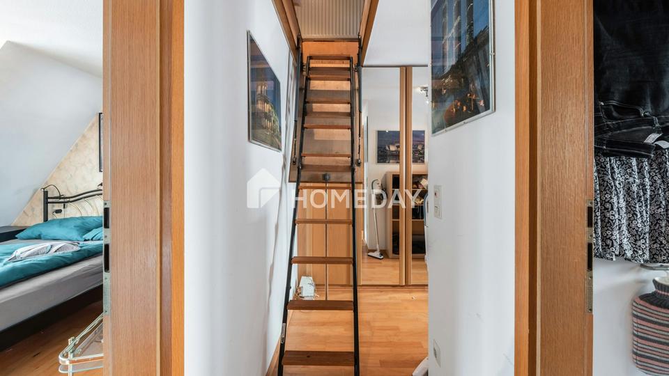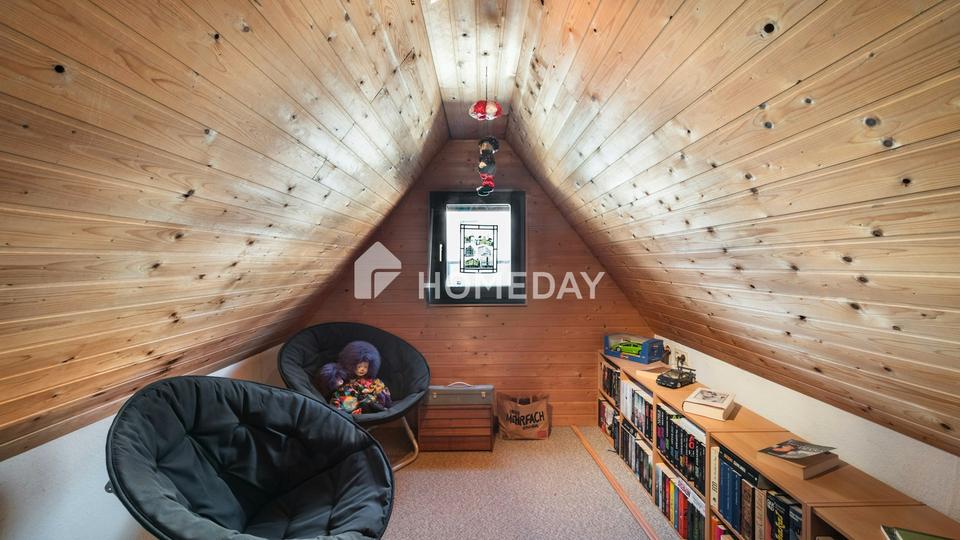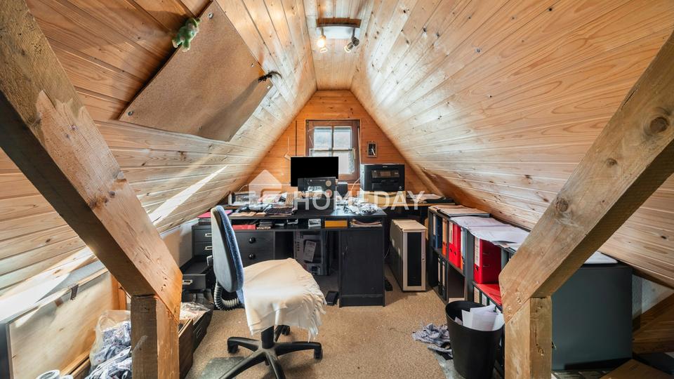 Über eine Auszugstreppe gelangen Sie in den zum Büro ausgebauten Dachbereich, welcher zur Wohnfläche von 54 qm noch hinzukommt. Die gemütlichen Dachschrägen mit Holzverkleidung schaffen hier eine heimelige Atmosphäre. Ob als Büro, Hobbyraum, Rückzugsort oder Kinderbereich – dieser Raum bietet vielfältige Nutzungsmöglichkeiten und bringt zusätzliche Wohnqualität ins Haus.
