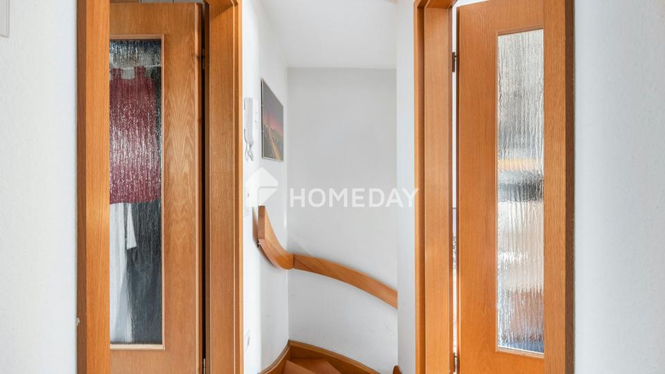 Im Erdgeschoss befinden sich die Garage sowie das Treppenhaus, das einen komfortablen Zugang ins Haus ermöglicht. Von hier aus führt die Treppe hinauf in den Wohnbereich – und schon beim ersten Schritt in die oberen Etagen wird deutlich, wie gemütlich dieses Haus gestaltet ist.
