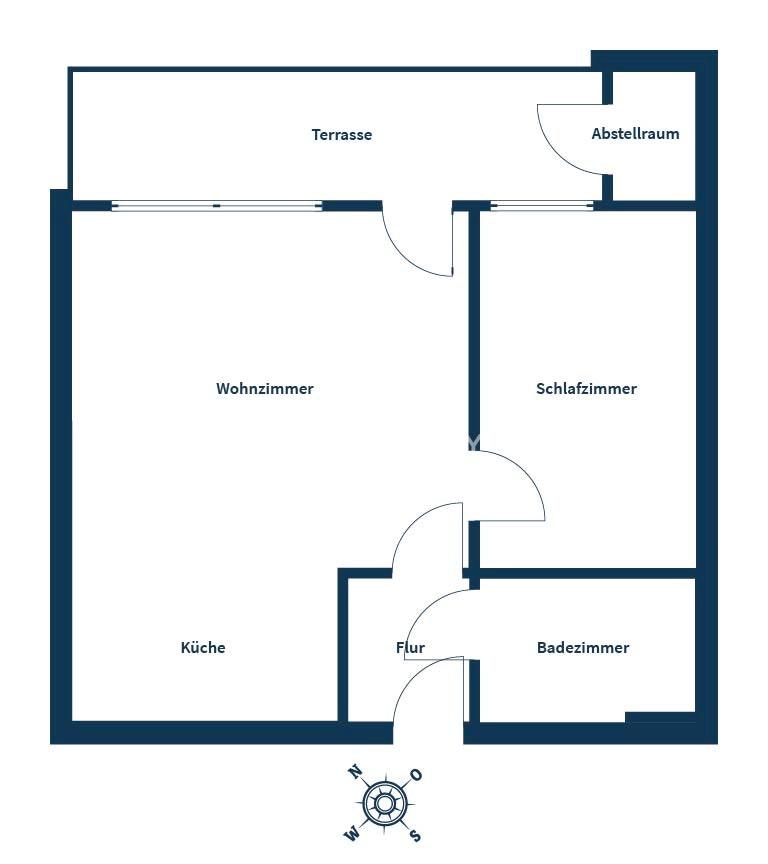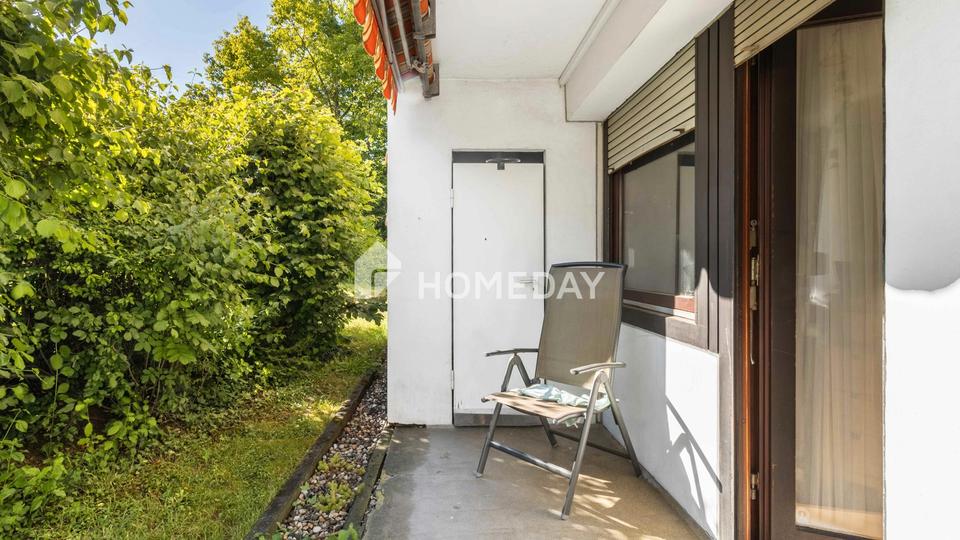 Über das gemeinschaftlich genutzte Treppenhaus gelangt man in die Wohnung, deren freundlicher Flur den Mittelpunkt bildet. Von hier aus sind das Badezimmer sowie das helle Wohnzimmer erreichbar, das durch seine angenehme Größe und den Zugang zur Terrasse besticht. Die überdachte Terrasse ist nach Nordosten ausgerichtet und bietet einen ruhigen Platz zum Entspannen – perfekt, um den Tag in angenehmer Atmosphäre ausklingen zu lassen.