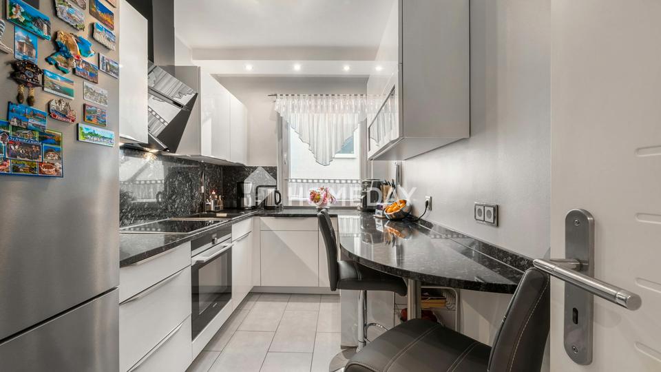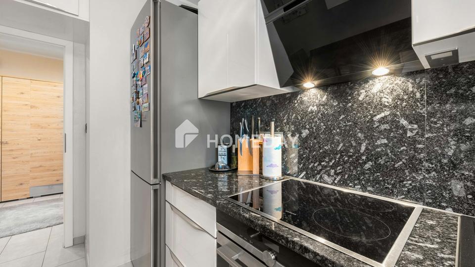 Die Einbauküche ist modern und gepflegt, ausgestattet mit hochwertigen Einbaugeräten, die funktionales und stilvolles Kochen ermöglichen. Das Badezimmer verfügt über eine komfortable Dusche sowie einen Handtuchwärmer und ist zeitlos gestaltet.