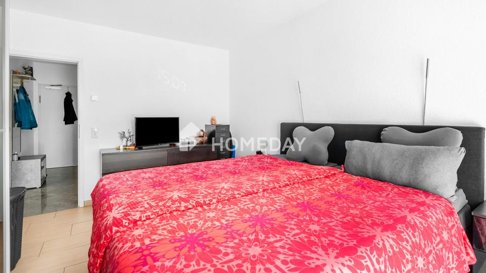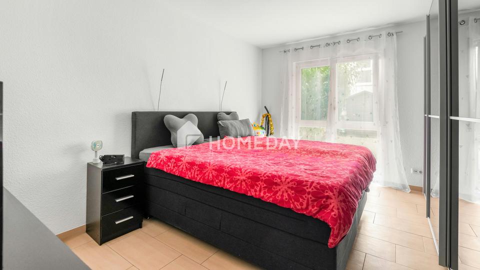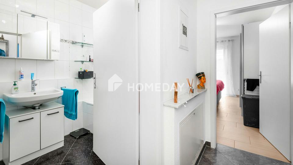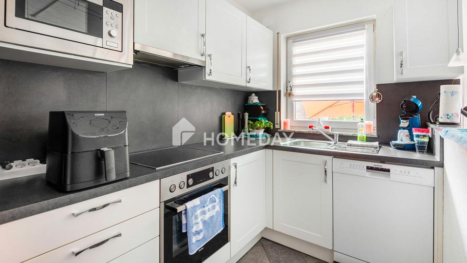 Der offene Grundriss verleiht der Wohnung ein modernes und luftiges Wohngefühl. Die offene Küche integriert sich harmonisch in das Wohnzimmer und bietet Raum für gemeinsames Kochen und gesellige Abende. Das Badezimmer überzeugt mit einer Kombination aus Badewanne und separater Dusche und befindet sich ebenfalls in einem gepflegten Zustand. Hochwertige Keramikfliesen in Marmor-Optik sowie eine Fußbodenheizung sorgen für ein angenehmes Wohnambiente. Elektrische Rollläden an den stabilen Kunststofffenstern mit Zweifach-Verglasung und Wärmeschutz runden die Ausstattung ab.