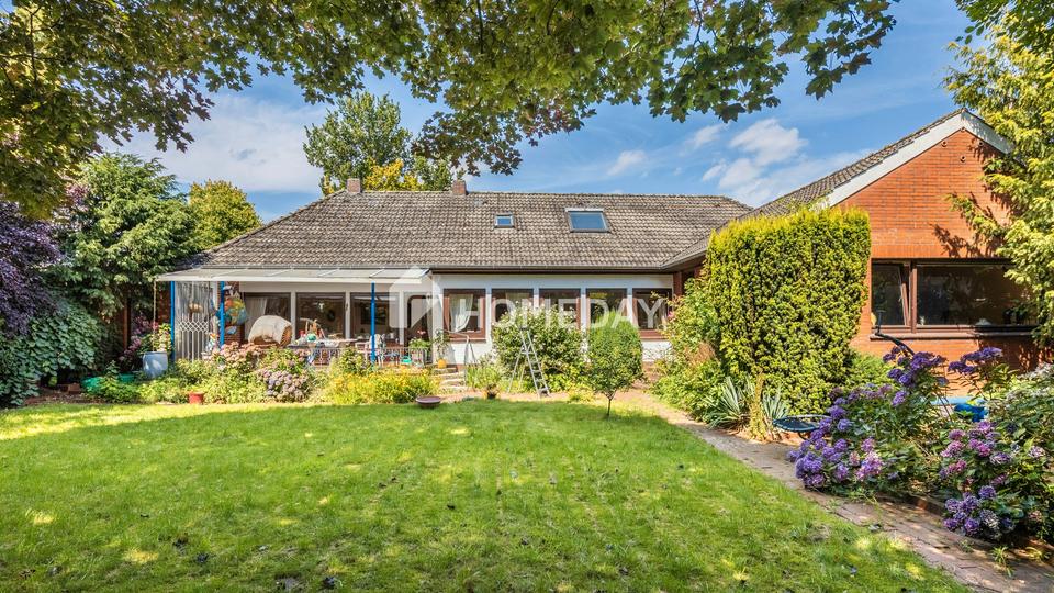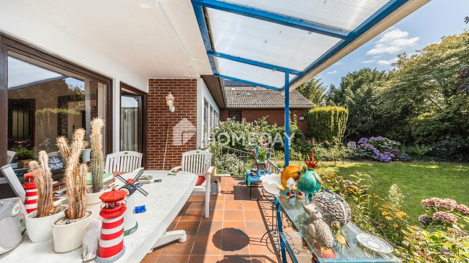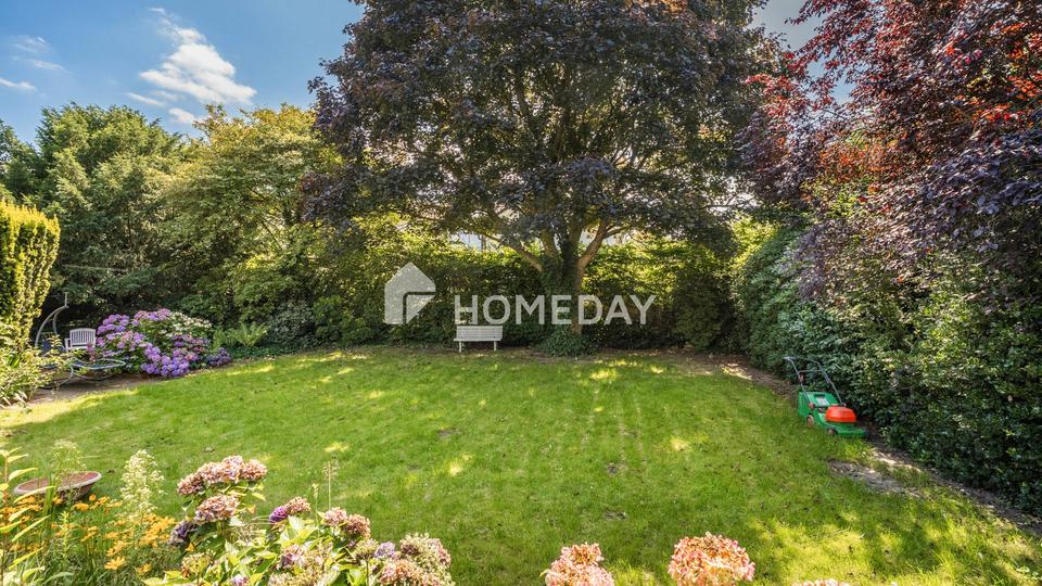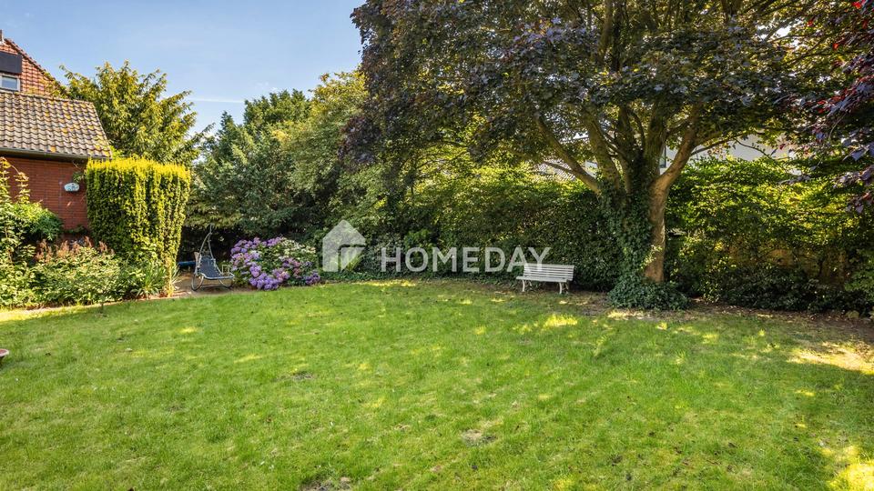 Der großzügige Wohn- und Essbereich besticht durch helle Fensterfronten und den direkten Zugang zur Terrasse. Hier lässt sich der Blick in den gepflegten Garten genießen, der mit einer Grundstücksfläche von ca. 900 Quadratmeter viel Raum für Erholung, Spiel und Freizeit bietet.