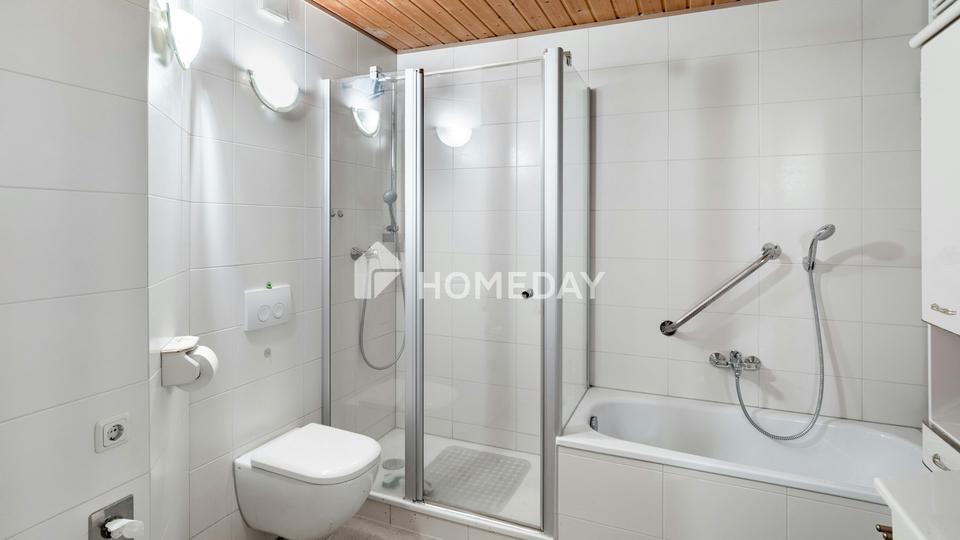 Das innenliegende Badezimmer wurde vor einigen Jahren saniert und präsentiert sich mit Badewanne und separater Dusche gepflegt und funktional. Vorhandene Schränke sorgen für praktischen Stauraum. Ergänzend steht ein separates WC zur Verfügung – ein nicht zu unterschätzender Komfort im Alltag.