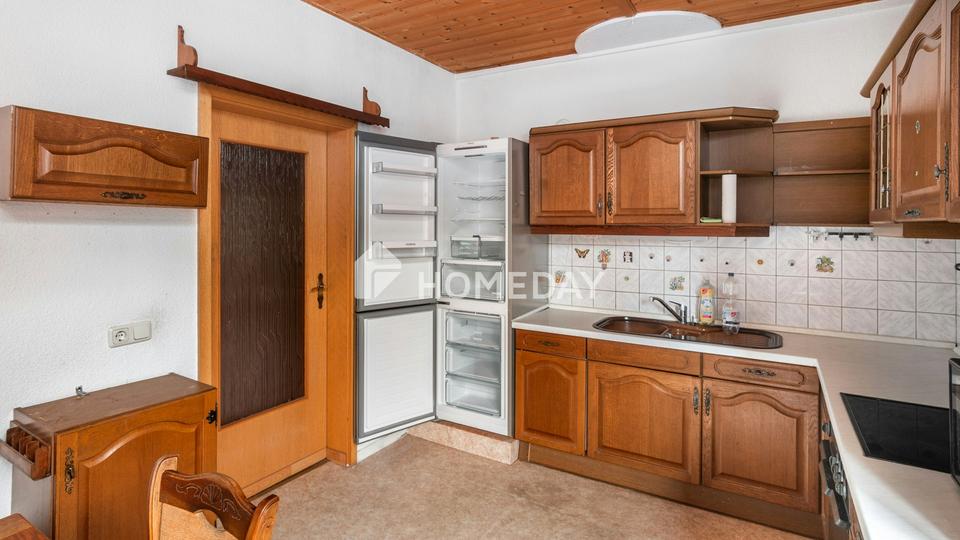 Die Küche ist funktional geschnitten und bietet ausreichend Platz für eine gemütliche Essecke. Von hier aus gelangt man auf die Loggia, die einen geschützten Außenbereich schafft – ideal für Pflanzen, einen kleinen Sitzplatz oder als ruhiger Rückzugsort.