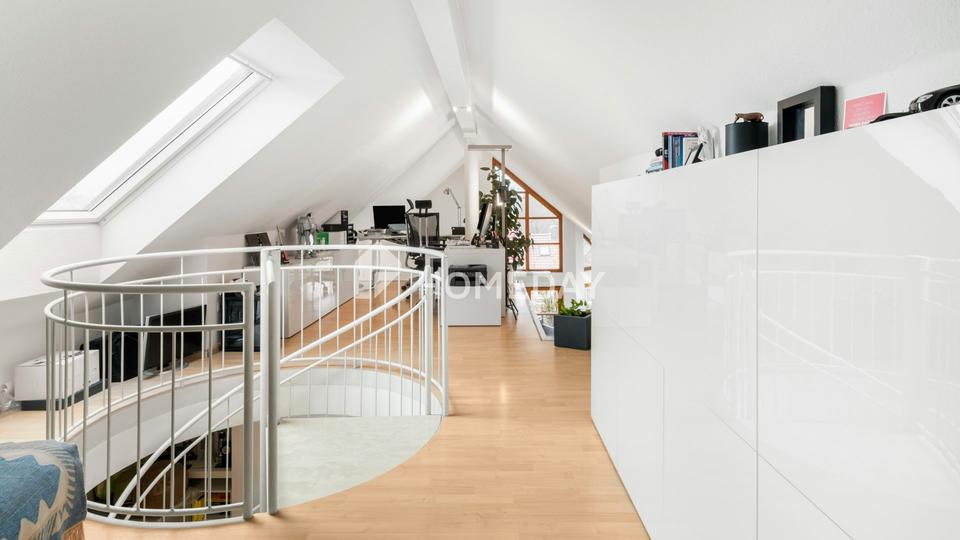 Der Wohnbereich wird durch die Galerie ergänzt, die sich sichtbar in den Raum öffnet und aktuell als Homeoffice genutzt wird. Diese architektonische Lösung sorgt für Weite, zusätzliche Lichtachsen und eine besondere Atmosphäre, die man in dieser Form selten findet.