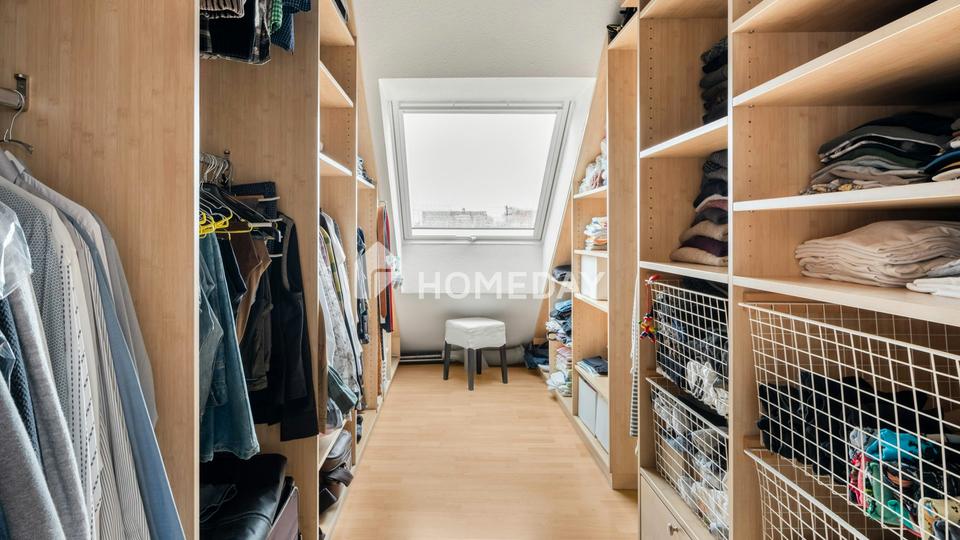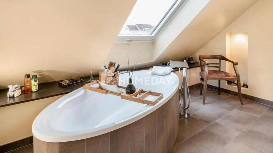 Das Dachgeschoss bildet den privaten Rückzugsbereich. Hier liegen das Schlafzimmer mit angrenzendem Ankleidezimmer sowie ein großzügiges Badezimmer, das 2007 erneuert wurde. Die freistehende Badewanne, eine ebenerdige Dusche, ein Bidet und ein Handtuchwärmer schaffen einen klaren Mehrwert im Alltag. Modernisierte Dachflächenfenster sorgen für viel Tageslicht und sind in den Wohnräumen mit elektrischem Sonnenschutz ausgestattet, der smart gesteuert werden kann. Die Wohnung wurde über die Jahre kontinuierlich modernisiert. Neuer Laminatboden wurde 2004 in der gesamten Wohnung verlegt, die Küche inklusive Raumkonzept 2011 erneuert, neue Heizkörper 2012 eingebaut und 2019 eine Klimaanlage installiert, die auch zum Heizen geeignet ist. Die Dachflächenfenster wurden in den letzten Jahren ausgetauscht.