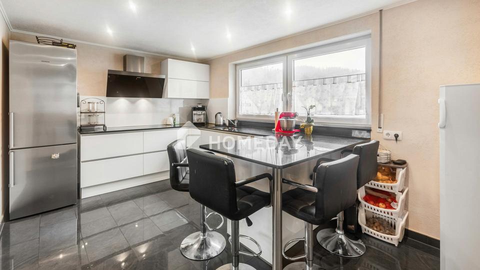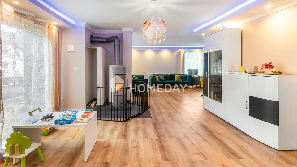 Für eine gemütliche Atmosphäre sorgt der Holz-Kaminofen aus dem Jahr 2009, der den Wohnbereich besonders einladend macht. Die großflächigen, 2021 erneuerten Fenster lassen viel Tageslicht in die Räume und bieten einen schönen Ausblick.