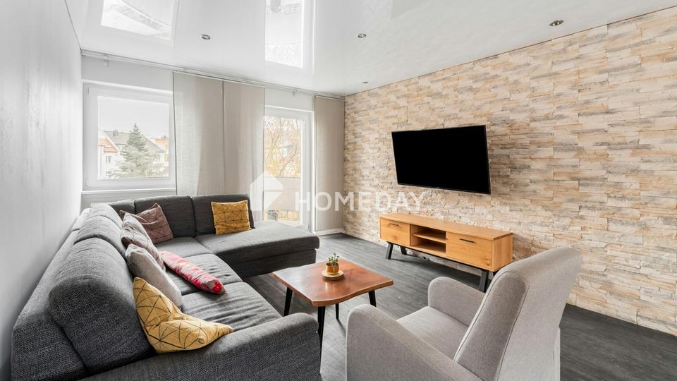 Das Schlafzimmer befindet sich auf der östlichen Seite und ist angenehm ruhig. Drei weitere Zimmer eignen sich als Gästezimmer, Kinderzimmer oder Homeoffice. Zwei Abstellräume halten Alltagsdinge aus dem Blick und geben den Wohnflächen spürbar Luft. Das modern geflieste Bad überzeugt mit einer bodengleichen Dusche, klarer Linienführung und einem aufgeräumten Eindruck. Deckeneinbauspots setzen Akzente und begleiten die wertige Modernisierung. Die Wohnung ist leerstehend und nahezu komplett möbliert, sodass Sie ohne große Vorbereitung starten können.