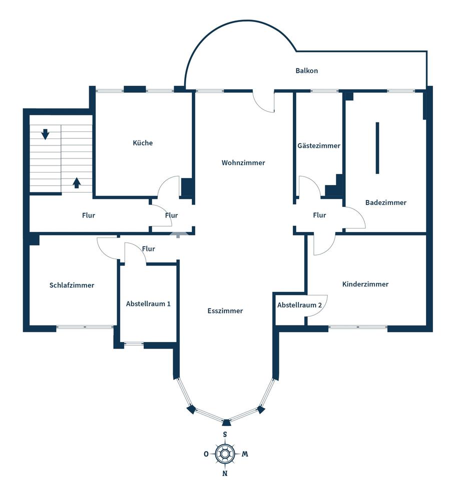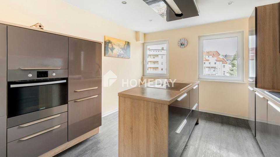 Der angrenzende Essbereich liegt im nördlich ausgerichteten Erker und bietet durch seine besondere Form eine einladende Atmosphäre für gesellige Abende. Die angrenzende Küche ist bewusst separat gehalten. Sie überzeugt mit einer hochwertigen Einbauküche samt Kochinsel und Markengeräten und ist ein echtes Highlight: klare Linien, wertige Materialien, durchdacht bis ins Detail.