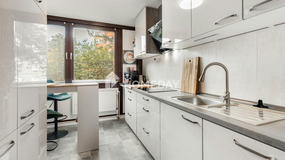 Das Highlight der Wohnung ist der offene, lichtdurchflutete Wohnbereich mit Zugang zum Balkon, der einen wunderbaren Blick ins Grüne bietet und zum Entspannen einlädt. Die separate Küche ist modern gestaltet und mit ausreichend Stauraum sowie Arbeitsfläche ausgestattet. Neben dem geräumigen Schlafzimmer mit eigener Loggia steht ein weiteres, gut nutzbares Zimmer zur Verfügung – ideal als Homeoffice, Gäste- oder Kinderzimmer.
