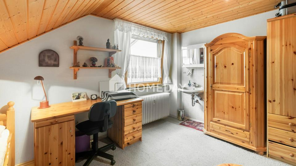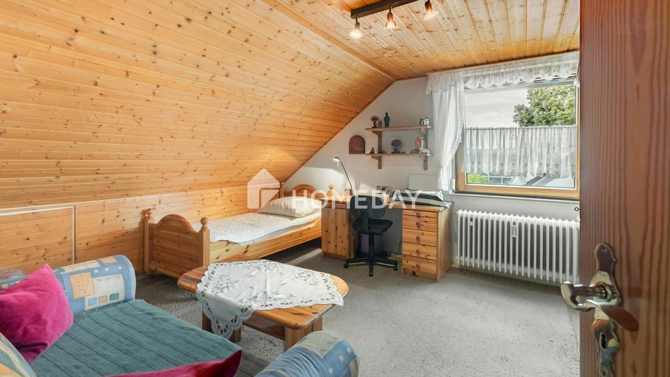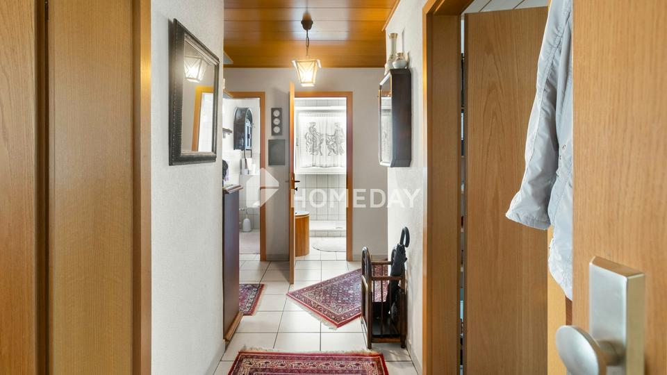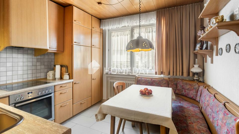 Diese attraktive Maisonettewohnung bietet auf rund 98 Quadratmeter Wohnfläche verteilt auf 5 Zimmer viel Platz für individuelles Wohnen. Durch den besonderen Grundriss werden die zwei Zimmer im Dachgeschoss über das gemeinsame Treppenhaus erschlossen – eine architektonische Besonderheit, die auch ideal ist für Wohnen und Arbeiten unter einem Dach oder älteren Kindern ihr eigenes Reich bietet. Das Bad wurde vor rund 10 Jahren renoviert und verfügt über eine begehbare Dusche. Ein separates WC steht zur Verfügung. Die gepflegte Einbauküche ist im Kaufpreis bereits enthalten. Selbstverständlich fehlt auch ein Kellerraum nicht. In der gemeinschaftlichen Waschküche ist Platz für die Waschmaschine.