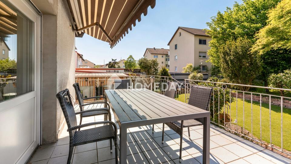 Im Erdgeschoss erwartet Sie ein lichtdurchflutetes Zimmer, das durch seine große, wärmegedämmte Schiebetür direkten Zugang zur geräumigen Terrasse (etwa 20 Quadratmeter groß) bietet. Diese ist mit einer elektrischen Markise ausgestattet und bereits für einen möglichen Wintergarten mit Fußbodenheizung vorbereitet. Von hier aus genießen Sie einen herrlichen Blick ins Grüne – ein idealer Ort, um zu entspannen oder Zeit mit Familie und Freunden zu verbringen.
