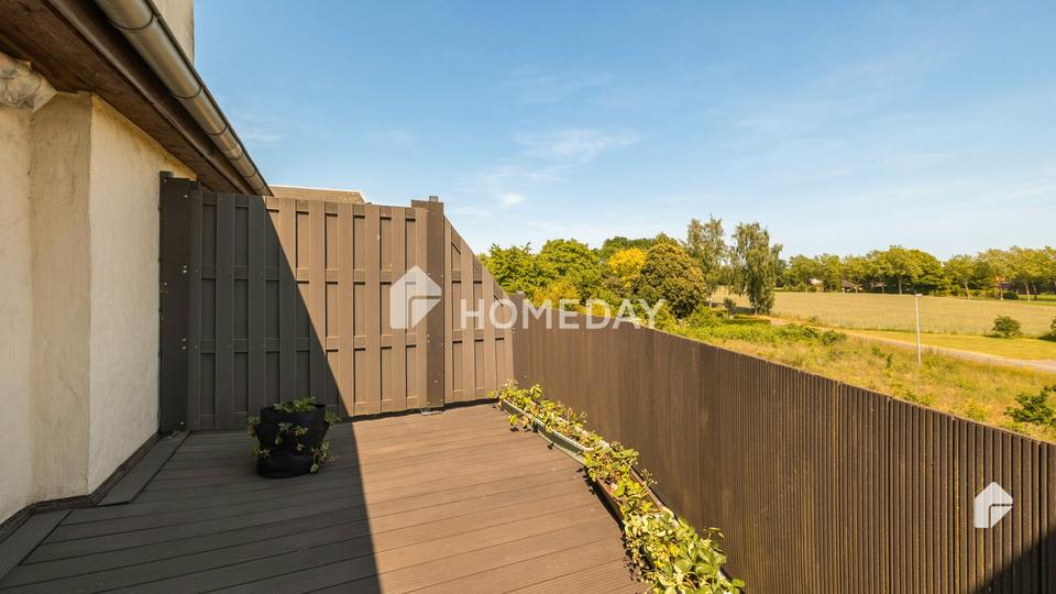 Die überdachte Loggia ist, genau wie die Dachterrasse, nach Osten ausgerichtet. Hier kann man den gelungenen Tag ausklingen lassen.