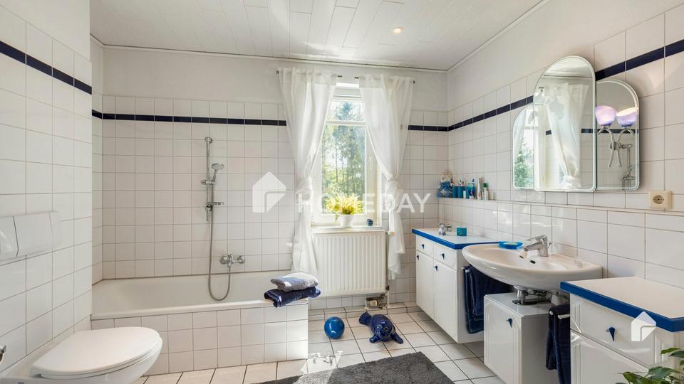 Die beiden hell gefliesten Tageslichtbäder sind groß und befinden sich in gutem Zustand. Zur Ausstattung gehören eine Badewanne, eine Dusche und ein Handtuchwärmer.