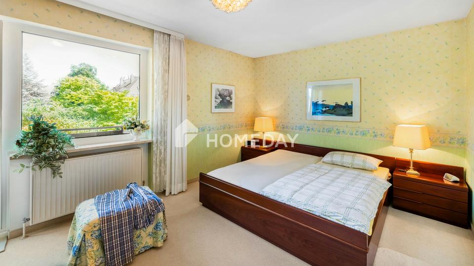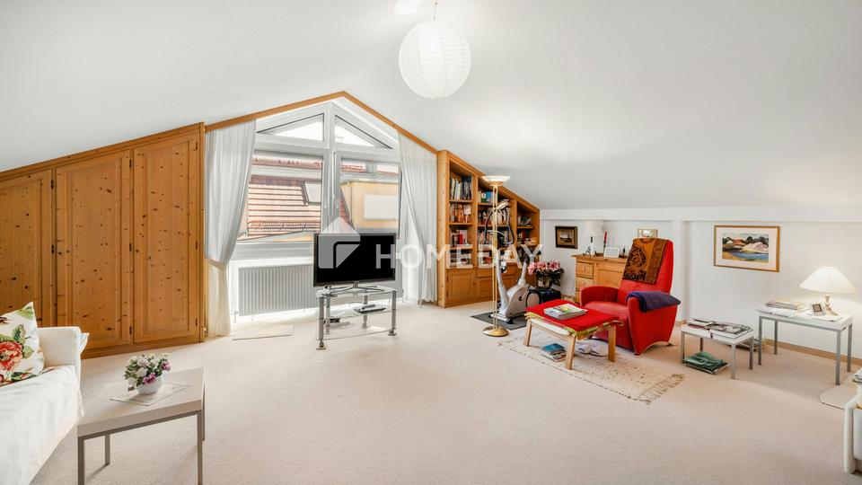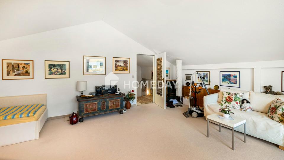 Über die innenliegende Treppe erreichen Sie das Dachgeschoss, das ein weiteres großzügiges Schlafzimmer sowie ein Tageslichtbad mit Waschmaschinenanschluss beherbergt. Diese Etage eignet sich hervorragend als privater Rückzugsbereich oder als unabhängiger Bereich für Gäste oder Teenager.