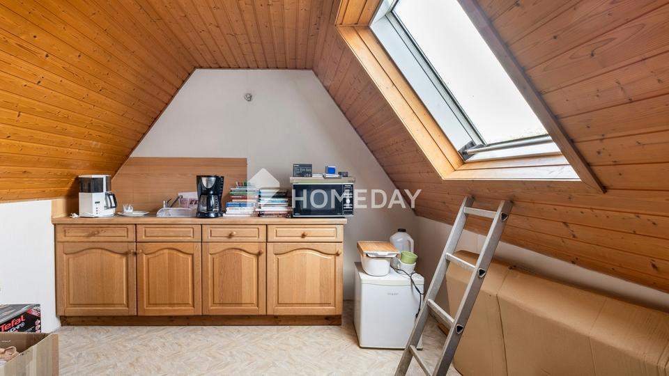Das Dachgeschoss bietet zusätzlichen Wohnraum mit einem weiteren Wohnzimmer, einem Schlafzimmer, einer Küche und einem Abstellraum.