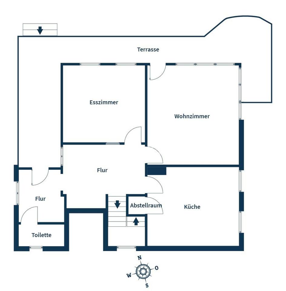 Im Erdgeschoss empfängt Sie ein großzügiges Wohnzimmer, das mit seinem direkten Zugang zur Terrasse den perfekten Ort für Entspannung und gesellige Stunden bietet. Die Terrasse selbst lädt zu entspannten Nachmittagen im Freien ein und erlaubt einen wunderschönen Blick auf den weitläufigen Garten, der mit seiner ruhigen Atmosphäre pure Entspannung verspricht. Neben dem Wohnzimmer befindet sich das Esszimmer, das viel Platz für einen großen Esstisch bereitstellt.