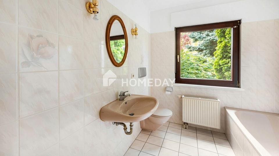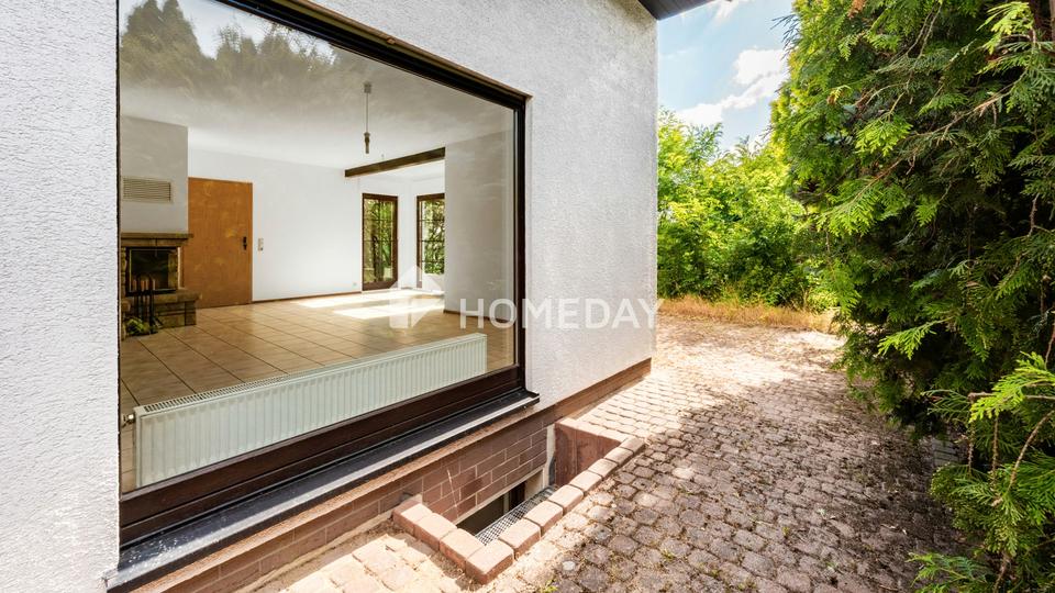 Treten Sie ein. Das großzügige, lichtdurchflutete Wohnzimmer mit gemütlichem Kamin. Der Blick schweift durch die bodentiefen Fenster direkt hinaus ins Grüne. Links davon öffnet sich die sonnige Terrasse – wie eine natürliche Verlängerung des Wohnzimmers unter freiem Himmel. Die angrenzende Küche bietet praktischen Raum für den Alltag. Zwei weitere helle Zimmer lassen sich flexibel als Kinder-, Gäste- oder Arbeitszimmer nutzen. Das Tageslichtbad mit Wanne, separater Dusche und Fenster rundet das Erdgeschoss funktional und gepflegt ab – bereit für Ihre persönlichen Akzente.