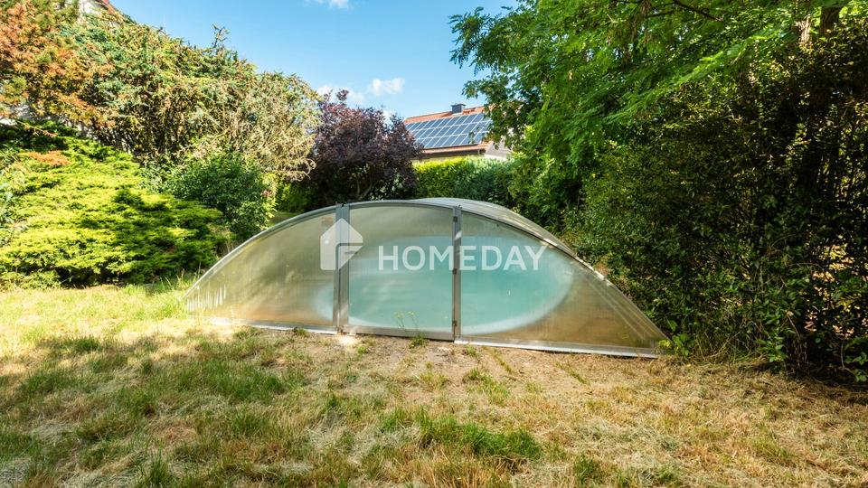 Schon beim Betreten des ca. 1.010 Quadratmeter großen Grundstücks wird klar: Hier geht es nicht nur ums Wohnen – sondern ums Ankommen. Die üppige Bepflanzung, die großzügig gepflasterte Zufahrt und die geschützte Terrasse in Südostausrichtung – jeder Bereich strahlt Ruhe und Privatsphäre aus. Das Highlight im Garten: ein überdachter Pool, der an warmen Tagen zum lebendigen Mittelpunkt für Familie und Freunde wird.