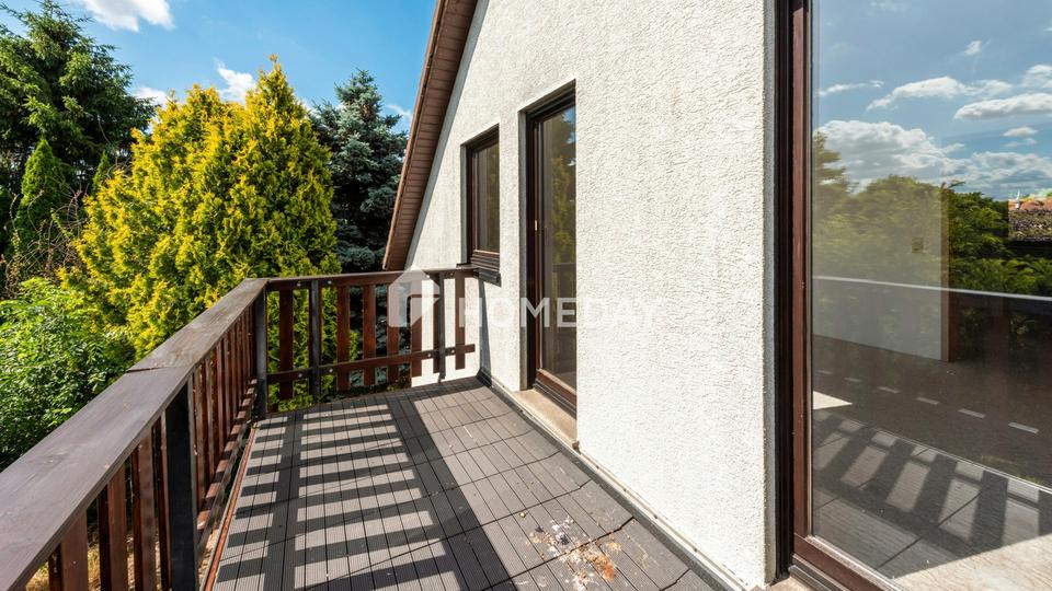Über eine formschöne Holztreppe gelangen Sie ins Obergeschoss zur Einliegerwohnung – ideal als Rückzugsort für Angehörige, zur Vermietung oder als ruhiger Homeoffice-Bereich. Auch hier überzeugt der großzügige Wohnraum mit direktem Zugang zum neu errichteten Balkon (2024) – ein sonniger Platz mit weitem Blick ins Grüne. Zwei weitere Zimmer, eine abgeschlossene Küche mit charmantem Dachfenster sowie ein helles Tageslichtbad mit Wanne vervollständigen das eigenständige Wohngefühl auf ca. 82 Quadratmetern.