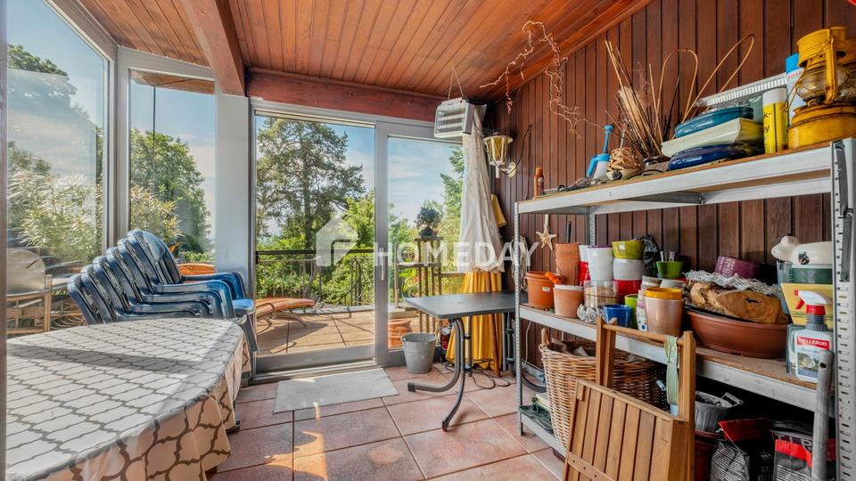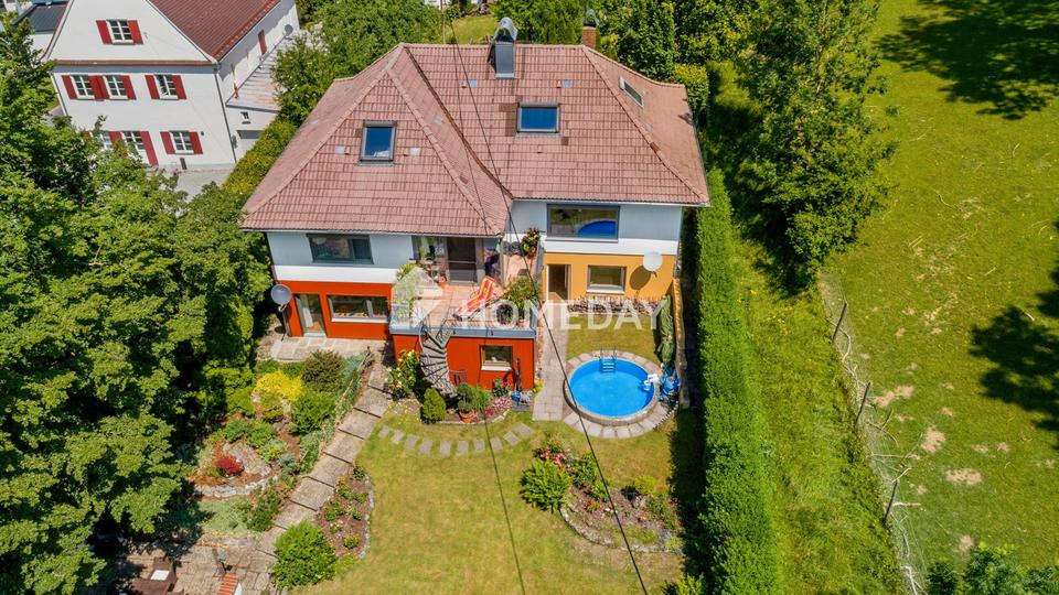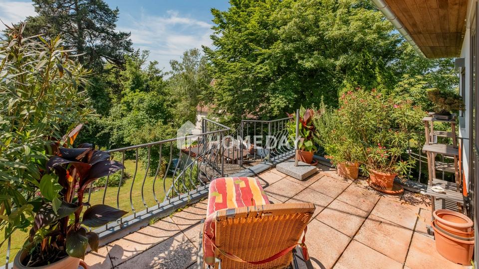 Der gepflegte Garten lädt mit weitläufigen Grünflächen, Terrassenbereichen und einem kleinen Pool zu entspannten Stunden im Freien ein. Die verschiedenen Balkon- und Terrassenflächen ermöglichen je nach Tageszeit Sonne oder Schatten – ideal für Familienleben, Hobbygärtner oder gesellige Runden im Sommer.