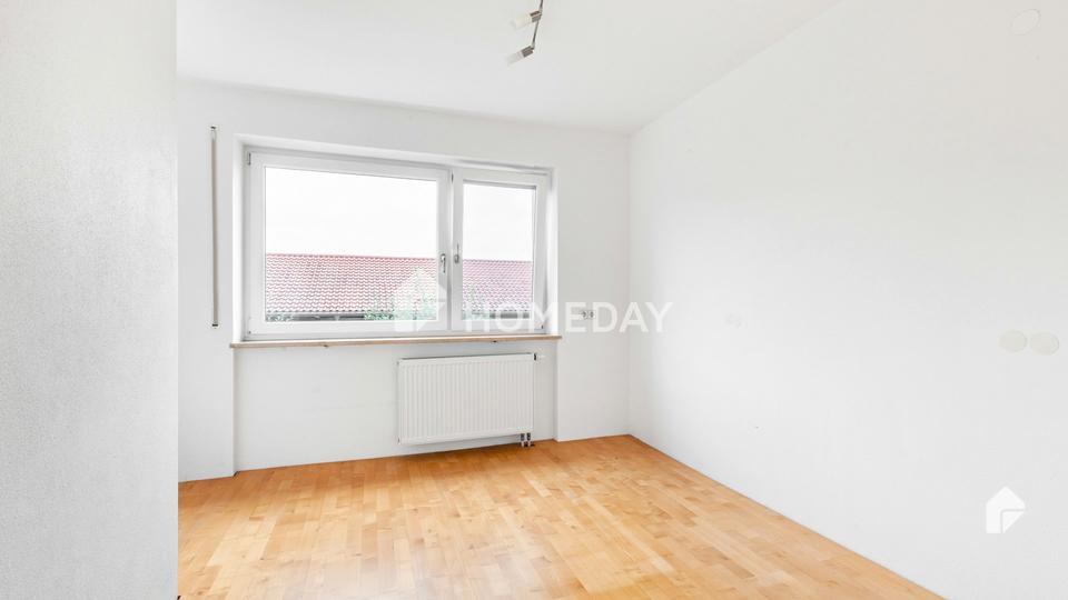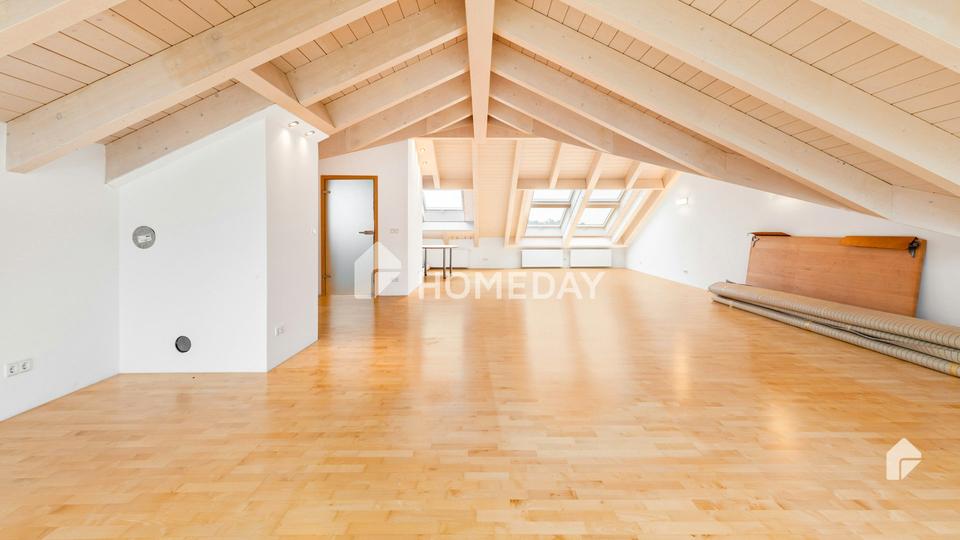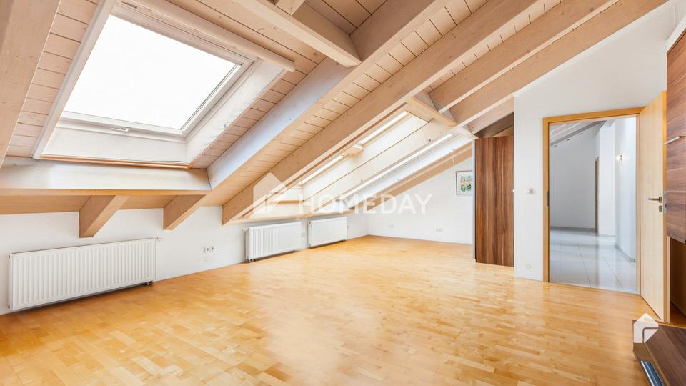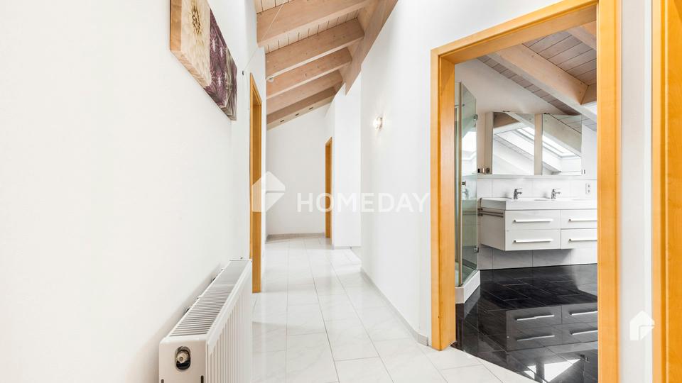 Das Obergeschoss beeindruckt mit drei weiteren Zimmern, von denen zwei als Schlaf- oder Kinderzimmer genutzt werden können. Das weitläufige Wohnzimmer mit seiner beeindruckenden Holzdecke verleiht dem Raum einen besonderen Charme. Zusätzlich stehen ein edles und modernes Tageslichtbad mit Regendusche und Eckbadewanne mit Whirlpool-Funktion, ein weiteres Gäste-WC und praktische Abstellbereiche gegenüber der Treppe und im Bad zur Verfügung.