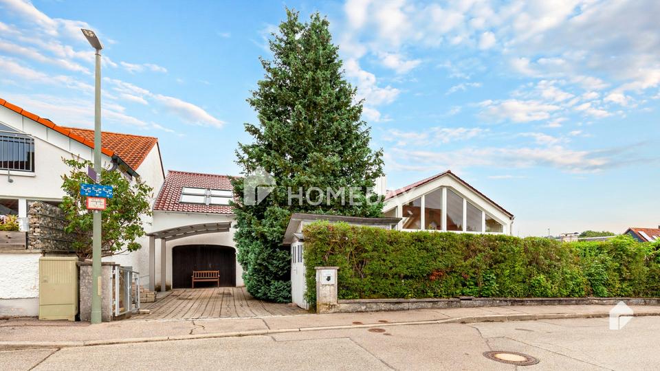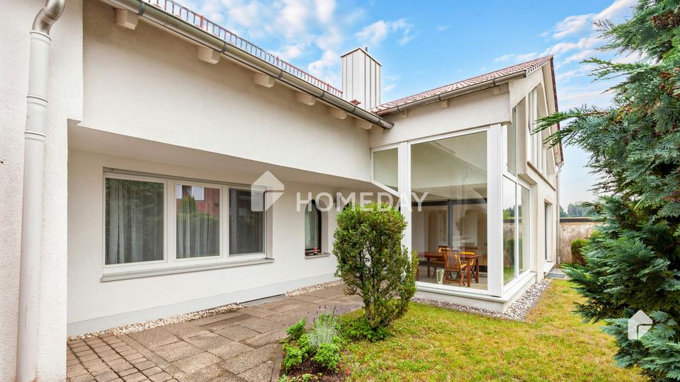 Das Grundstück, das durch seine zur Straßenseite uneinsehbare Lage Privatsphäre garantiert, bietet ein durchweg gepflegtes Erscheinungsbild. Im Erdgeschoss erwarten Sie vier Zimmer, von denen drei flexibel als Schlafzimmer, Büro oder Gästezimmer genutzt werden können. Das große Tageslichtbad, ausgestattet mit Badewanne, separater Dusche und Bidet, sowie ein zusätzliches Gäste-WC bieten Komfort und Funktionalität. Die moderne, elegant in Weiß gehaltene Einbauküche ist ein Highlight und befindet sich am großzügigen Wohnzimmer, das durch einen gemütlichen Kamin und große Fensterfronten besticht. Von hier aus haben Sie Zugang zur geschützten Terrasse, die sich perfekt für entspannte Stunden mit Familie und Freunden eignet, sei es bei einem Grillabend oder einem gemütlichen Treffen.