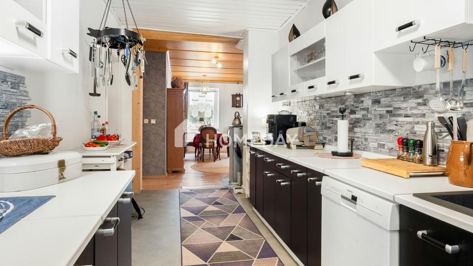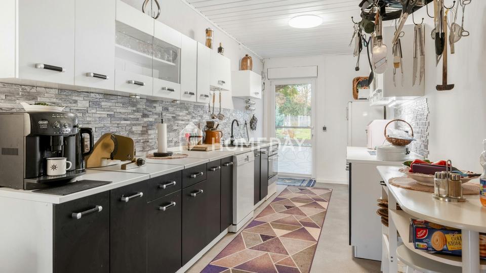Die offene, im Jahr 2024 erneuerte Küche fügt sich harmonisch in das Wohnkonzept ein. Mit direktem Zugang zur überdachten Terrasse wird sie zum natürlichen Treffpunkt für Familie und Freunde. Von hier schweift der Blick über die weitläufige Außenfläche – aktuell naturbelassen, bietet sie große Freiheit für individuelle Gestaltung: ob Nutzgarten, Spielfläche oder grüne Oase.