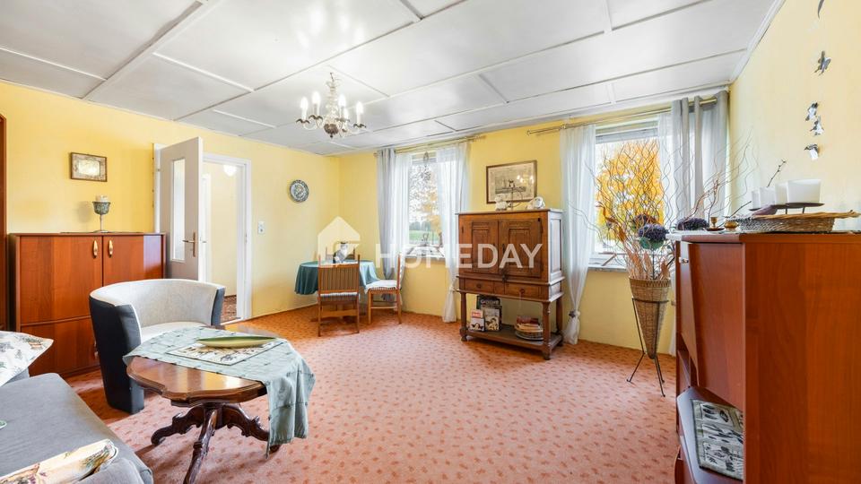 Im Inneren zeigt sich das Haus großzügig und vielseitig nutzbar. Zwei Wohnzimmer bieten unterschiedliche Raumstimmungen: Das eine ist mit Laminat ausgelegt und eignet sich als heller, kommunikativer Mittelpunkt des Hauses, das andere mit weicher Auslegware schafft einen ruhigen Rückzugsort. Ein Kaminofen spendet behagliche Wärme und sorgt gerade an kühleren Tagen für eine angenehme Wohnatmosphäre.