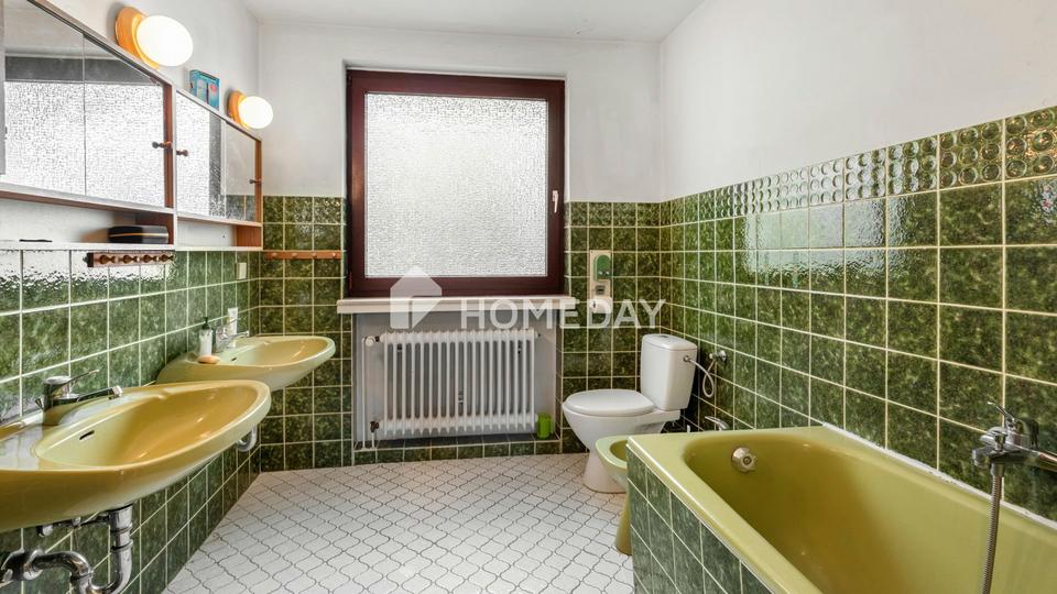 Obergeschoss: Drei gut geschnittene Zimmer – darunter zwei Kinderzimmer und ein Schlafzimmer – bieten ausreichend Platz für die Familie oder das Homeoffice. Ein grünes Retro-Bad mit Wanne verleiht nostalgischen Charme. Ein kleiner Abstellraum sorgt für zusätzlichen Stauraum.