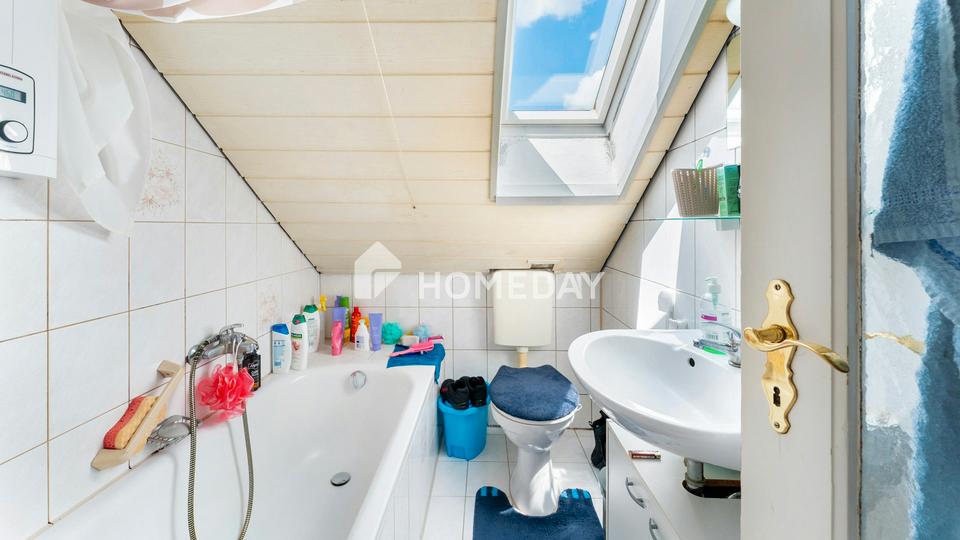 Das Tageslichtbad wurde vor 25 Jahren erneuert und verfügt über eine Dusch-Badewanne sowie Waschbecken und WC.