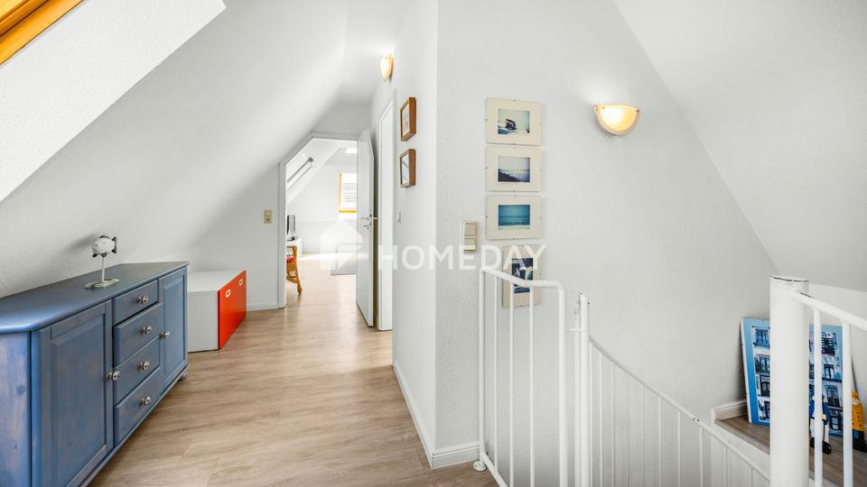 Im 1. Obergeschoss empfängt Sie ein einladender Flur mit Zugang zum Gäste-WC. Das großzügige Wohnzimmer ist das Herzstück dieser Ebene – hier treffen warme Laminatböden auf charmante Dachschrägen und viel Tageslicht. Der angrenzende Balkon bietet mit seinem Windschutz einen geschützten Rückzugsort im Freien mit sonniger Südausrichtung – ideal für eine kleine Auszeit mit einem guten Buch und entspannte Stunden unter freiem Himmel.