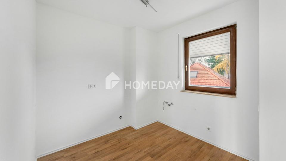 Der großzügige Wohnbereich im ersten Obergeschoss beeindruckt durch seine Helligkeit und den direkten Zugang zur Loggia, die einen schönen Blick in die grüne Umgebung bietet – ein Ort, der zum Entspannen und Verweilen einlädt. Das Wohnzimmer besticht durch klare Linien, helle Wandflächen und den gepflegten Laminatboden, der dem Raum eine warme Atmosphäre verleiht. Angrenzend befindet sich die Küche, die durch ihre praktische Raumaufteilung vielfältige Gestaltungsmöglichkeiten bietet. Auf derselben Ebene steht zudem ein separates Gäste-WC zur Verfügung.