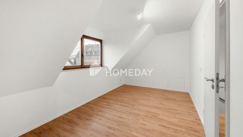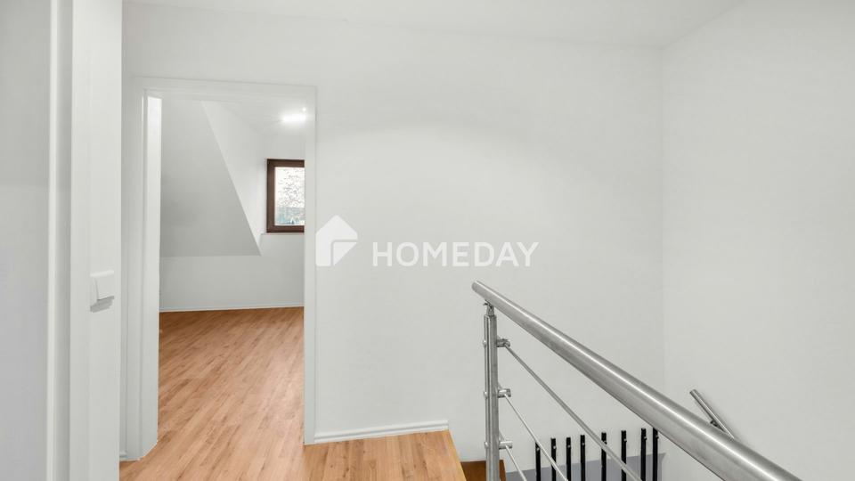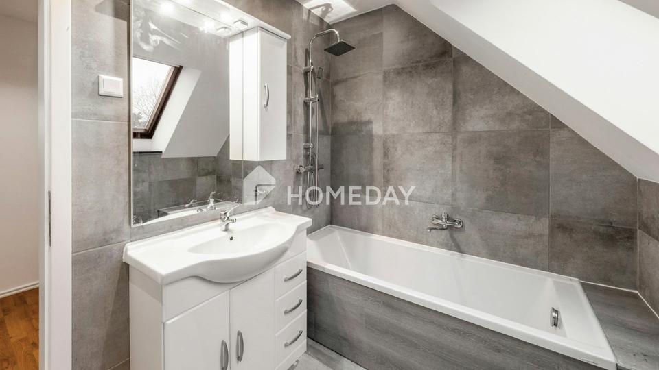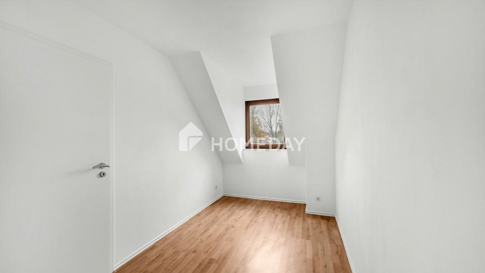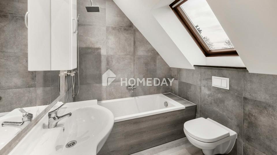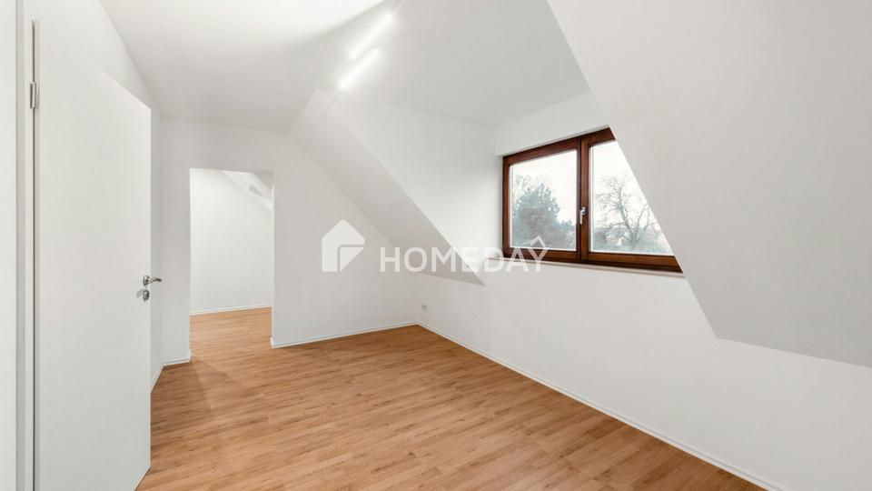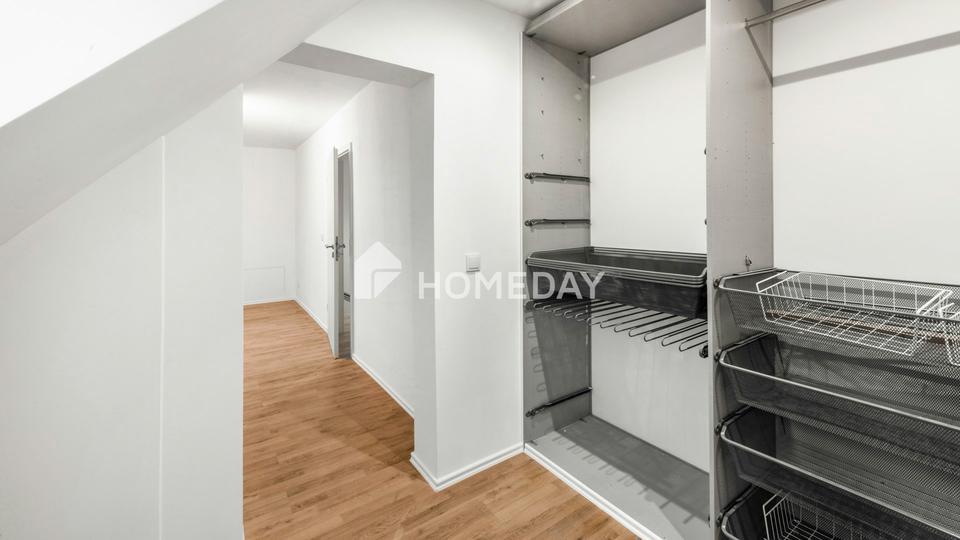 Über eine elegante Echtholztreppe gelangt man in das Dachgeschoss, das den privaten Rückzugsbereich bildet. Hier befinden sich das gemütliche Schlafzimmer mit angrenzendem Ankleidezimmer, ein helles Kinderzimmer sowie das geschmackvoll modernisierte Badezimmer. Das geschmackvoll geflieste Tageslichtbad mit Badewanne vermittelt durch seine helle Gestaltung eine angenehme Wohlfühlatmosphäre.