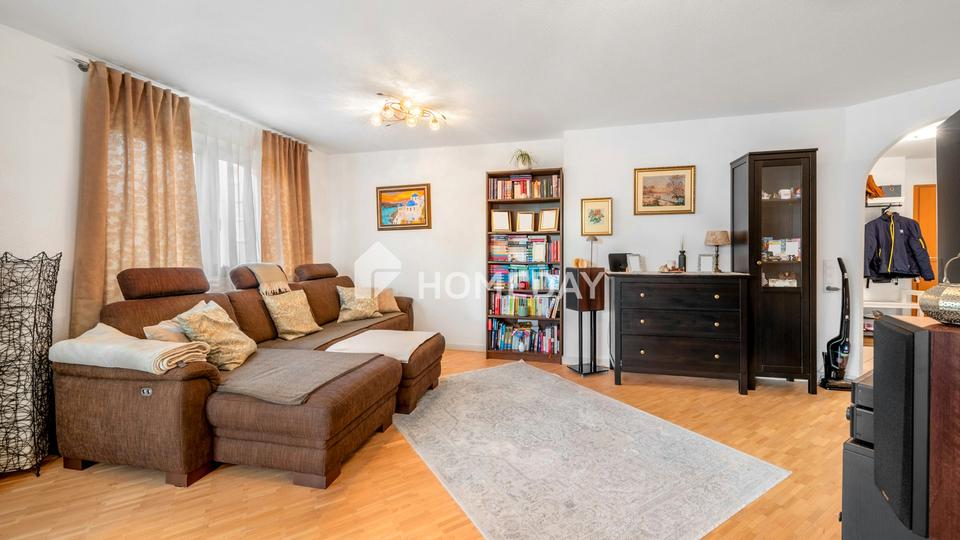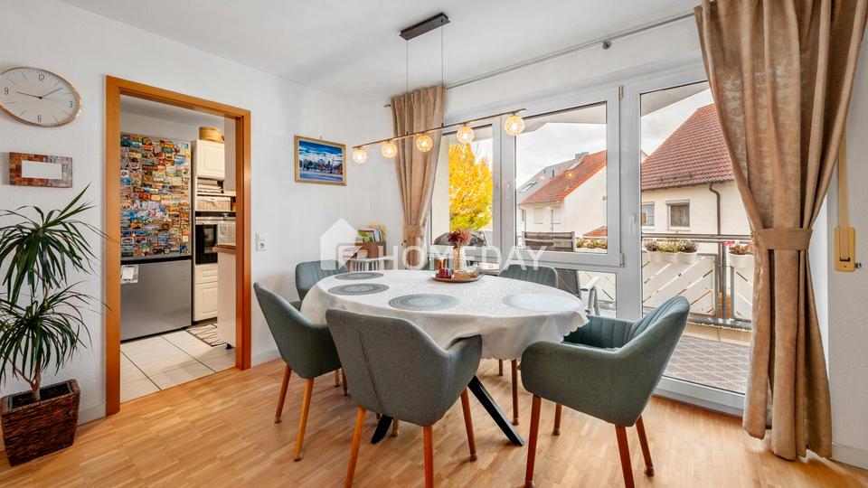 Der großzügige Wohn- und Essbereich empfängt Sie mit viel Tageslicht, bodentiefen Fenstern und einem hellen Ambiente, das sich nahtlos auf den Balkon fortsetzt. Der Blick in die ruhige Nachbarschaft und die überlegte Raumaufteilung schaffen eine Atmosphäre, die zum Durchatmen einlädt – perfekt für Feierabende und gemeinsame Stunden.
