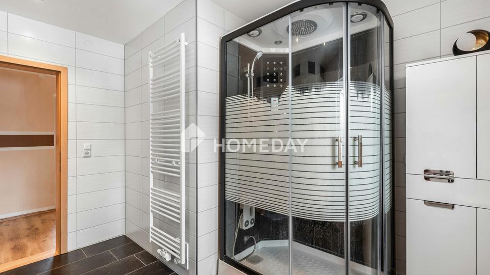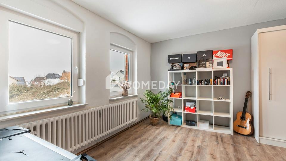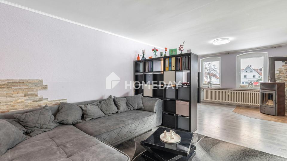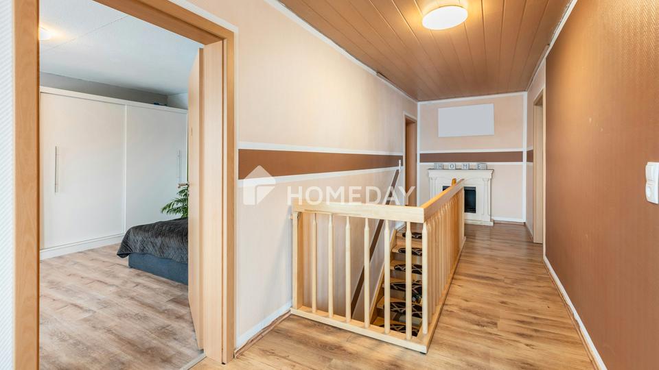 Im Inneren überzeugt die Immobilie durch helle Räume und eine klassische Grundrissstruktur. Zwei Tageslichtbäder sorgen für Komfort im Alltag. Das Badezimmer im Obergeschoss wurde 2017 modernisiert und verfügt über eine Fußbodenheizung. Ein Kamin im Wohnzimmer schafft zusätzlich eine behagliche Atmosphäre.