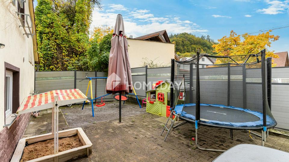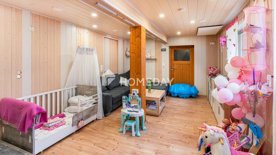 Das Haus besticht durch seinen gepflegten Außenbereich mit einer kleinen privaten Oase hinter dem Haus. Hier befindet sich ein geschützter Freisitz, der zum Verweilen im Grünen einlädt. Zusammen mit einer zweiten Terrasse bietet sich hier Platz für Entspannung, Grillabende und gesellige Stunden. Auf der zweiten Terrasse wurde ein Spielparadies für Kinder geschaffen – ein hauseigener Spielplatz.