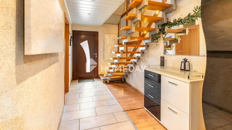 Im Erdgeschoss befindet sich ein Badezimmer mit Dusche und Badewanne, während das luxuriöse Bad im Obergeschoss mit Eckbadewanne und einer Dusche mit Massagefunktion höchsten Komfort bietet – eine echte Wohlfühloase im Alltag.