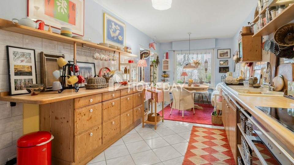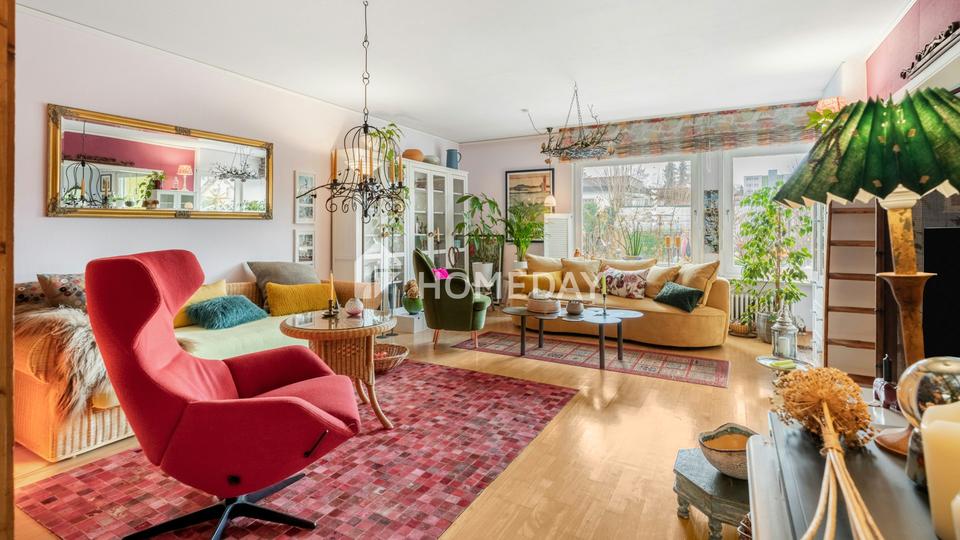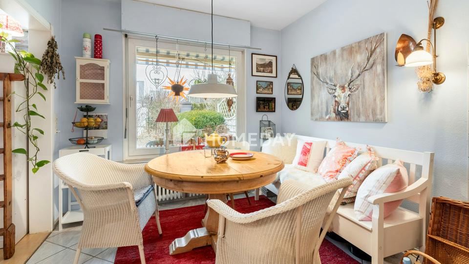 Bereits beim Betreten des Hauses wird die angenehme Wohnatmosphäre spürbar. Das Herzstück bildet das helle Wohnzimmer mit knapp 30 Quadratmetern Wohnfläche, das durch große Fensterflächen lichtdurchflutet ist und einen schönen Blick in den Garten eröffnet. Direkt angrenzend befinden sich die Küche mit praktischem Vorratsraum sowie ein großzügiger Essbereich auf insgesamt ca. 17 Quadratmetern, der ausreichend Platz für gemeinsame Mahlzeiten und gesellige Abende bietet.