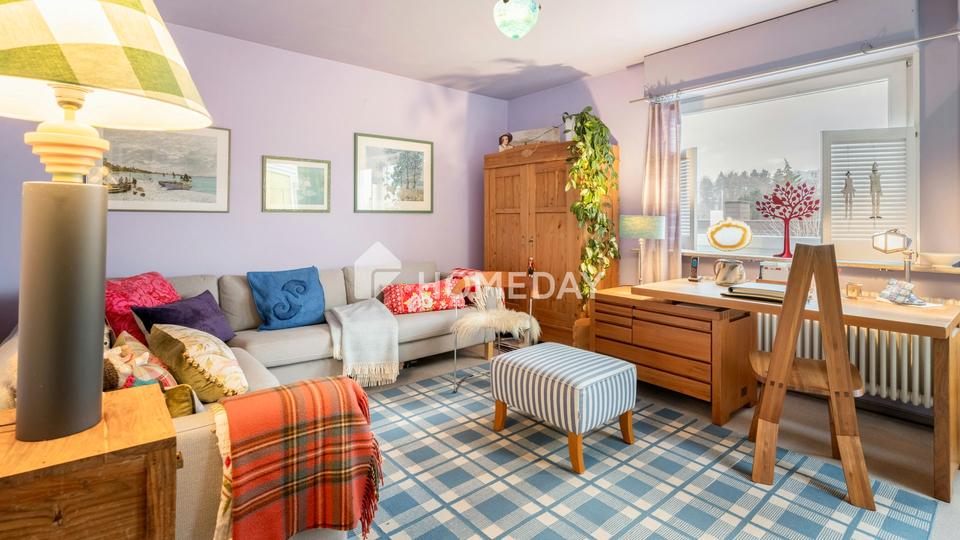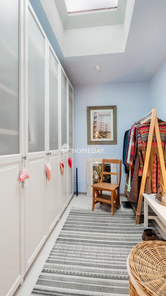 Im Obergeschoss erwarten Sie gut geschnittene private Rückzugsräume. Besonders hervorzuheben ist das geräumige Tageslichtbad, ausgestattet mit Badewanne und Dusche. Ein separates Ankleidezimmer mit Oberlicht sorgt für zusätzlichen Komfort und Stauraum. Ein echtes Highlight ist die ca. 5 Quadratmeter große Loggia, die durch eine Pergola mit Rollläden nahezu den Charakter eines Wintergartens erhält und ganzjährig nutzbar ist.