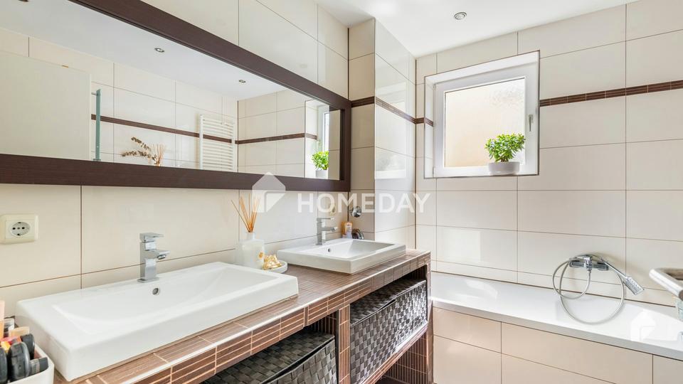• Das Tageslichtbad bietet ein Doppelwaschbecken, eine Wanne, eine Dusche und einen Handtuchwärmer.