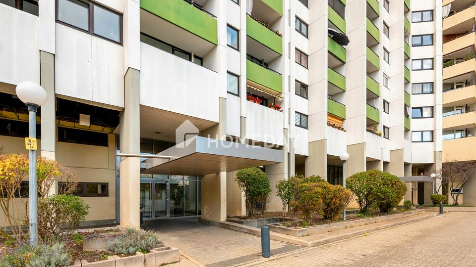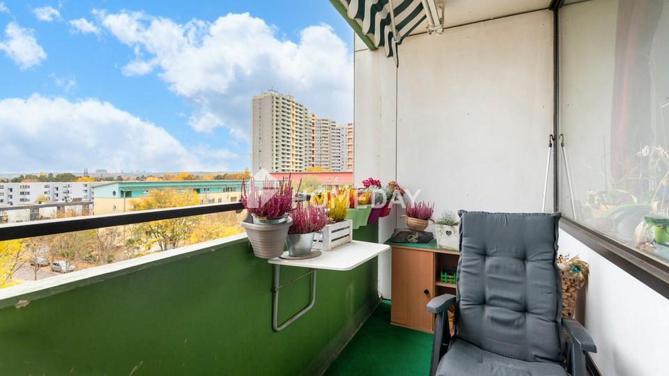 Im Inneren erwartet Sie ein klar strukturiertes Zuhause mit circa 45,15 Quadratmetern. Der Wohnbereich öffnet sich zur Loggia und holt viel Tageslicht ins Zimmer. Die Loggia zeigt nach Süden und besitzt eine Markise, ideal für Frühstück in der Sonne oder die abendliche Pause mit Blick über die Stadt.