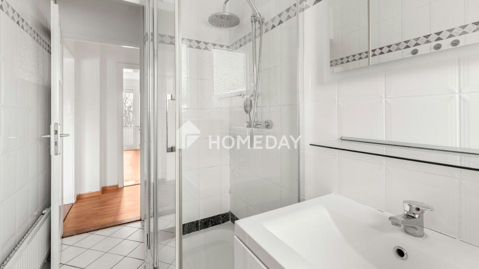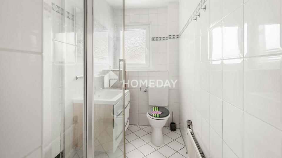 Abgerundet wird das Raumangebot durch das Tageslichtbad, das sich hell und freundlich zeigt. Es ist gepflegt, mit einer Dusche ausgestattet.