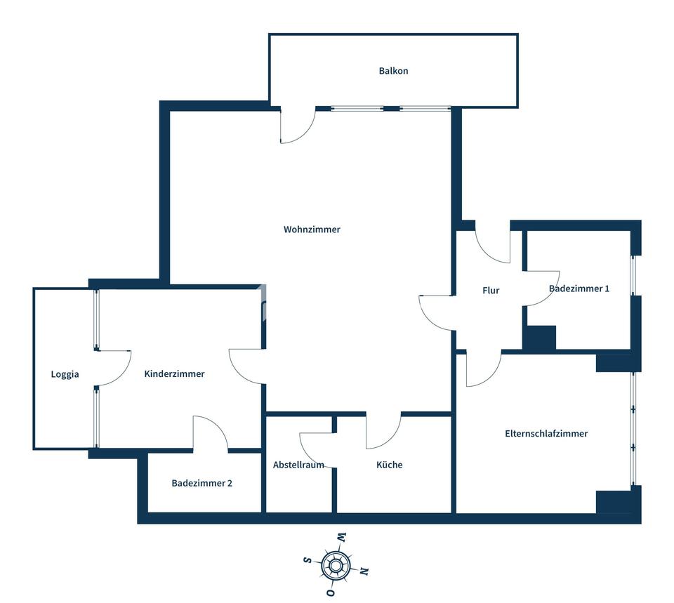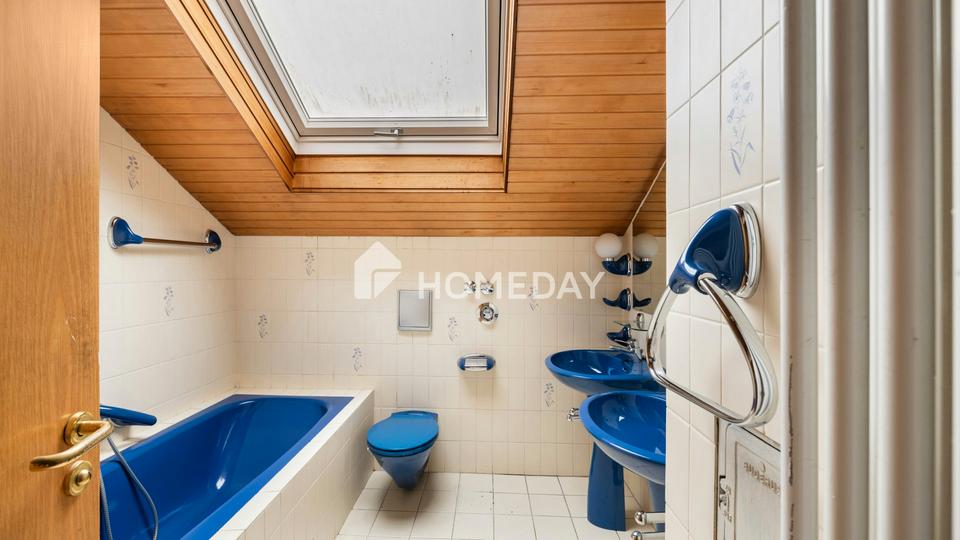 Die Küche ist funktional gestaltet und durch ihre Lage hervorragend in den Wohnfluss integriert. Das zentral gelegene Elternschlafzimmer wirkt durch seine großzügigen Proportionen und die Fensterflächen besonders freundlich. Ein weiteres Zimmer eignet sich als Kinderzimmer, Gästezimmer oder Büro und profitiert ebenfalls von den lichtdurchfluteten Strukturen. Zwei gepflegte Badezimmer, eines mit Wanne und eines mit Dusche, ergänzen den Wohnkomfort und schaffen Flexibilität im Alltag.