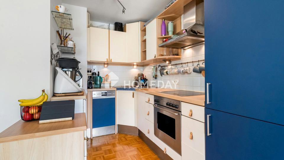 Die Wohnung verfügt über zwei Bäder: Ein Badezimmer ist mit einer Badewanne ausgestattet, das andere mit einer Dusche – beide in gepflegtem Zustand und passend zum zeitlosen Stil der gesamten Wohnung. Die separate Küche ist mit einer funktionalen Einbauküche versehen, inklusive Herd, Backofen und Dunstabzugshaube.