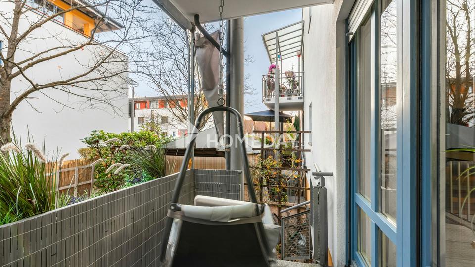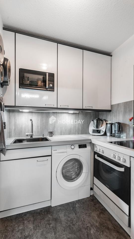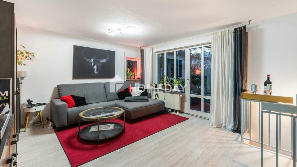 Das Wohnzimmer bildet den zentralen Mittelpunkt der Wohnung und überzeugt durch seine klare Struktur sowie den direkten Zugang zum überdachten Westbalkon, der den Tag mit angenehmer Abendsonne ausklingen lässt. Die Küche ist mit einer funktionalen und gepflegten Einbauküche ausgestattet, die alle wichtigen Geräte wie Herd, Backofen und Dunstabzugshaube umfasst. Das Wannenbad fügt sich harmonisch in das stimmige Gesamtbild ein und präsentiert sich in einem gut erhaltenen Zustand.