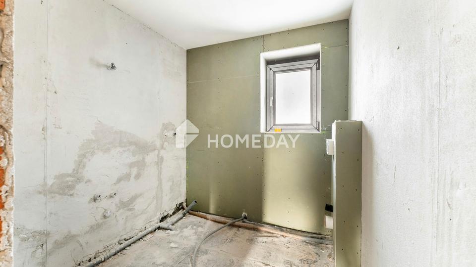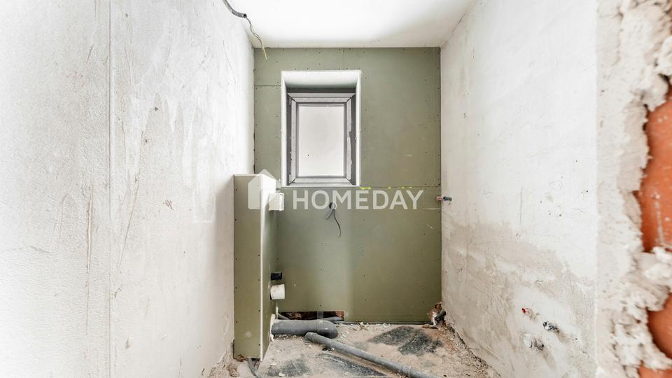 Die zukünftige Heizlösung war ursprünglich als Kombination aus Infrarot-Heizung mit Unterstützung durch eine Photovoltaik-Anlage konzipiert. Aktuell ist jedoch noch keine Zentralheizung installiert. Die notwendigen Leitungen, Materialien sowie sämtliche Technikkomponenten für den Einbau sind bereits vor Ort. Um das Gebäude vollständig nutzbar zu machen, müssen noch eine Zentralheizung eingebaut, Estrich verlegt, Bodenbeläge sowie Türen montiert und die Bäder gefliest werden. Darüber hinaus steht auch die Gestaltung der Außenanlagen, insbesondere die Pflasterung der Wege und Parkflächen, noch aus. Der gesamte Investitionsbedarf zur Fertigstellung wird mit etwa 100.000 bis 120.000 Euro beziffert.