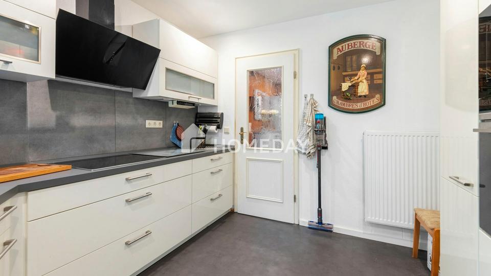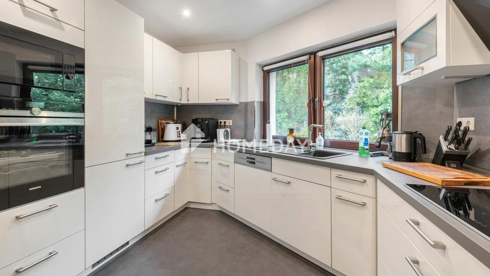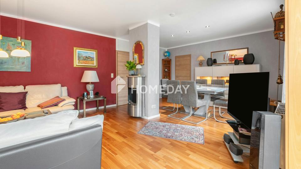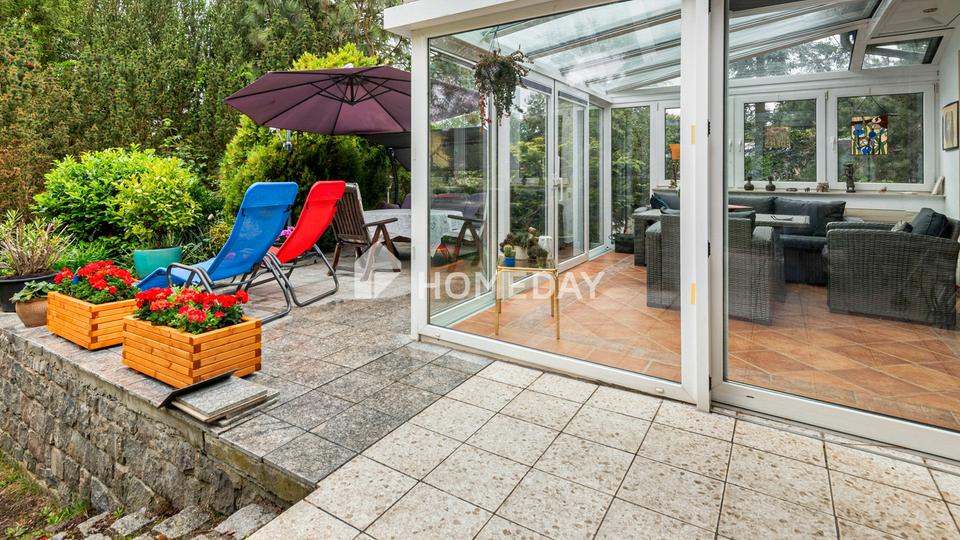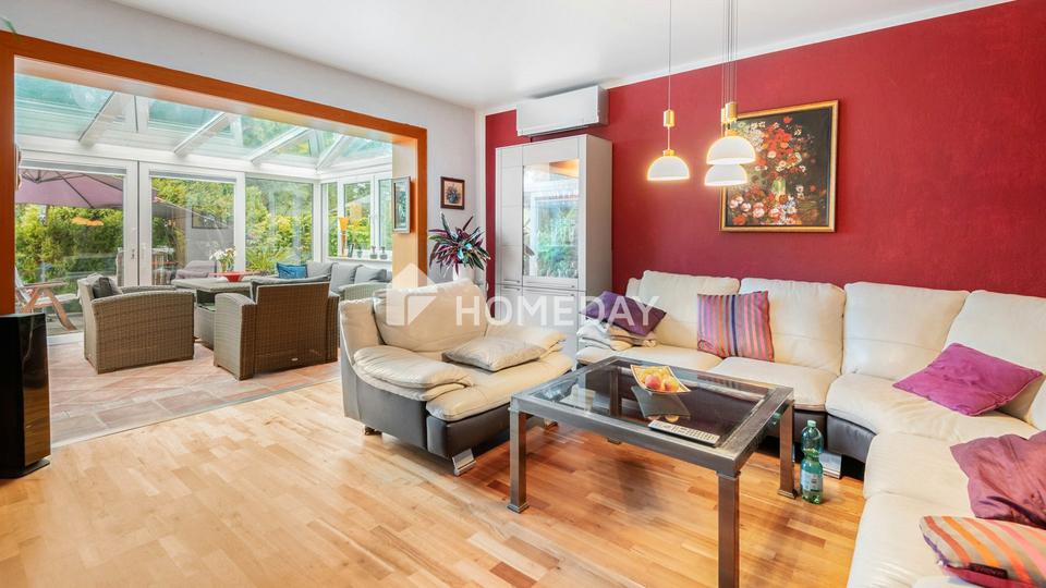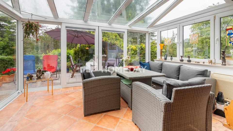 Die Wohnfläche von rund 105,5 Quadratmetern verteilt sich auf zwei gut geschnittene Zimmer, die durch ihre Helligkeit und den durchdachten Grundriss bestechen. Den Mittelpunkt des Hauses bildet das großzügige Wohnzimmer mit separatem Essbereich und offenem Übergang in den stilvollen Wintergarten. Große Fensterflächen durchfluten diesen Bereich mit Tageslicht und schaffen eine einladende, entspannte Atmosphäre – ein Ort zum Durchatmen und Genießen. Ob als Rückzugsort mit Blick ins Grüne oder als behaglicher Platz für den Sonntagskaffee: Der Wintergarten verbindet Wohnen mit Natur auf besonders harmonische Weise.